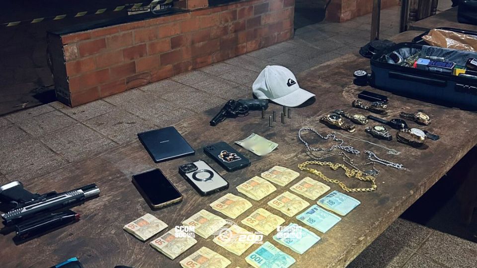No imóvel, foram apreendidos um revólver calibre .38 com numeração suprimida, munições, drogas, dinheiro, relógios, perfumes, joias, celulares, um tablet, além de dois veículos — um Renault Sandero e uma BMW 320i, ambos sem registro de furto ou roubo.