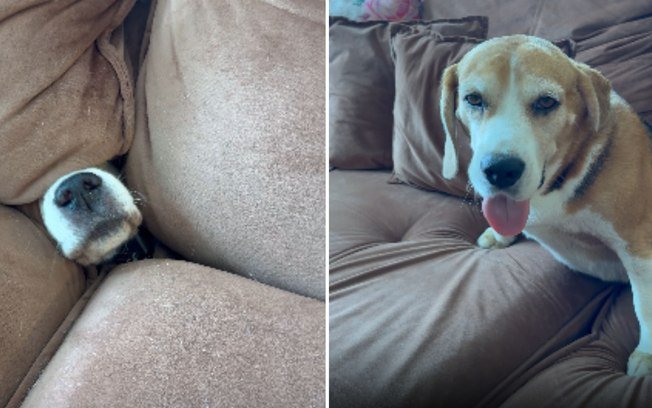 Conhecido por ficar eufórico sempre que escuta “voar”, termo usado durante o preparo do paramotor, o animal surpreende ao optar por se esconder no sofá, evitando a movimentação.