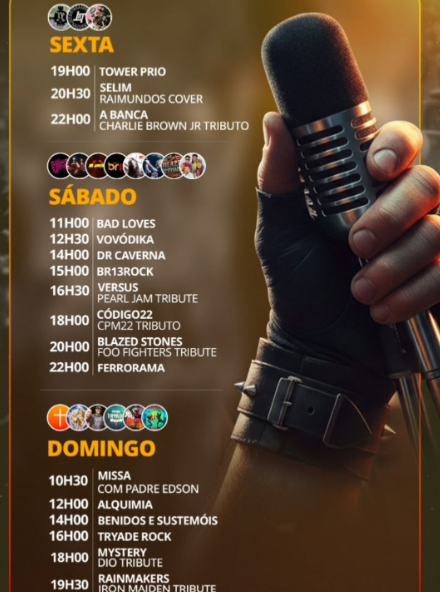 O domingo reserva um momento especial com a tradicional missa celebrada pelo Padre Edson às 10h30. Logo após, o heavy metal domina o encerramento com tributos a Dio e Iron Maiden.