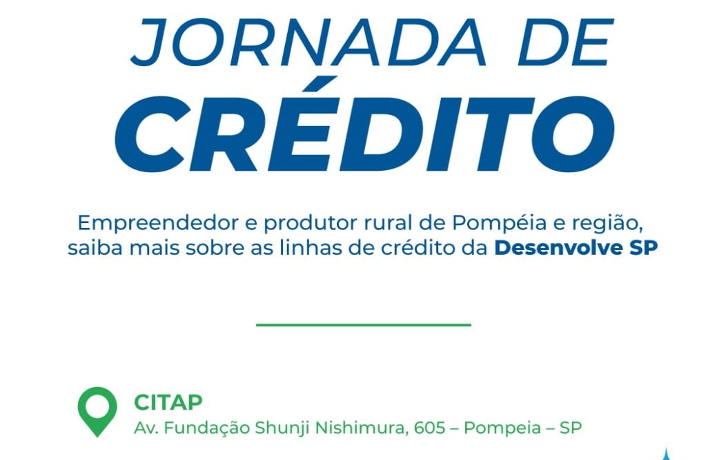 A Desenvolve SP realiza, no dia 13 de abril, a Jornada de Crédito em Pompeia. O evento gratuito é voltado a empresários e empreendedores da região que buscam modernizar seus negócios, investir em inovação ou tirar projetos do papel com taxas competitivas.