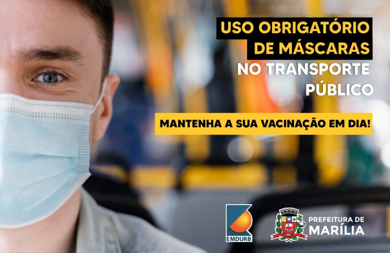 A Prefeitura de Marília, por meio da Secretaria Municipal da Saúde e através da Vigilância Sanitária, informa que passou a ser obrigatório o uso de máscara de proteção facial nos ônibus do transporte coletivo e também no interior do Terminal Rodoviário Urbano.
