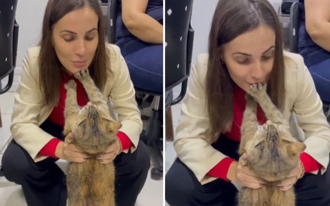 As imagens foram registradas por Gisele Ferri, que flagrou o momento em que dá um puxão de orelha na felina. Na cena, ela brinca com a situação ao repreender Madalena por viver fugindo do escritório, lembrando que o “trabalho” da gata seria cuidar do local.