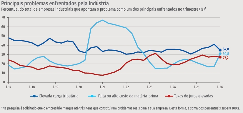 A elevada carga tributária continua liderando o ranking dos principais problemas enfrentados pela indústria. No 1º trimestre de 2026, o entrave foi apontado por 34,8% dos empresários, com queda de 6,3 pontos percentuais em relação à percepção no 4º trimestre do ano passado.