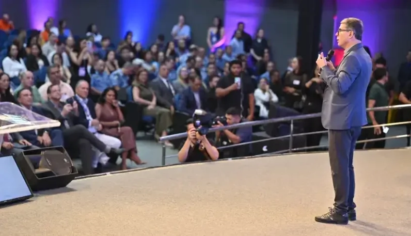 Durante o evento, Haroldo Dutra falou sobre o “gestor do futuro” e abordou as mudanças no perfil de liderança diante do avanço da tecnologia e da inteligência artificial.