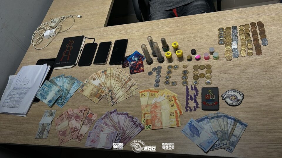 Com apoio das demais equipes, os policiais localizaram um dos indivíduos. Durante as buscas, foram apreendidos 18 eppendorfs de cocaína, três cigarros de maconha prontos para consumo, quatro tubos contendo maconha, cinco tubos de “ICE”, além de R$ 2.671,90 em espécie, distribuídos em notas fracionadas e moedas, anotações relacionadas ao tráfico de drogas e três aparelhos celulares.