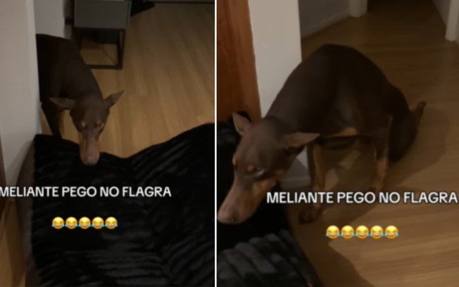 Uma cena inusitada registrada dentro de casa tem divertido os internautas ao mostrar o flagrante de um cachorro após aprontar enquanto o tutor estava fora.