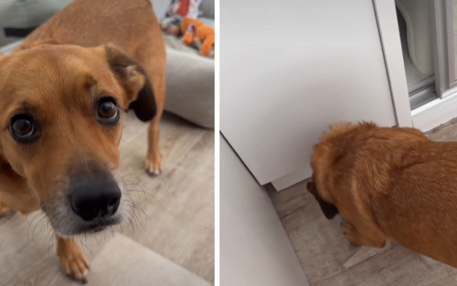 Uma cena dentro de casa acabou repercutindo nas redes sociais ao mostrar o momento em que um cachorro caramelo é flagrado após danificar o piso da residência.
